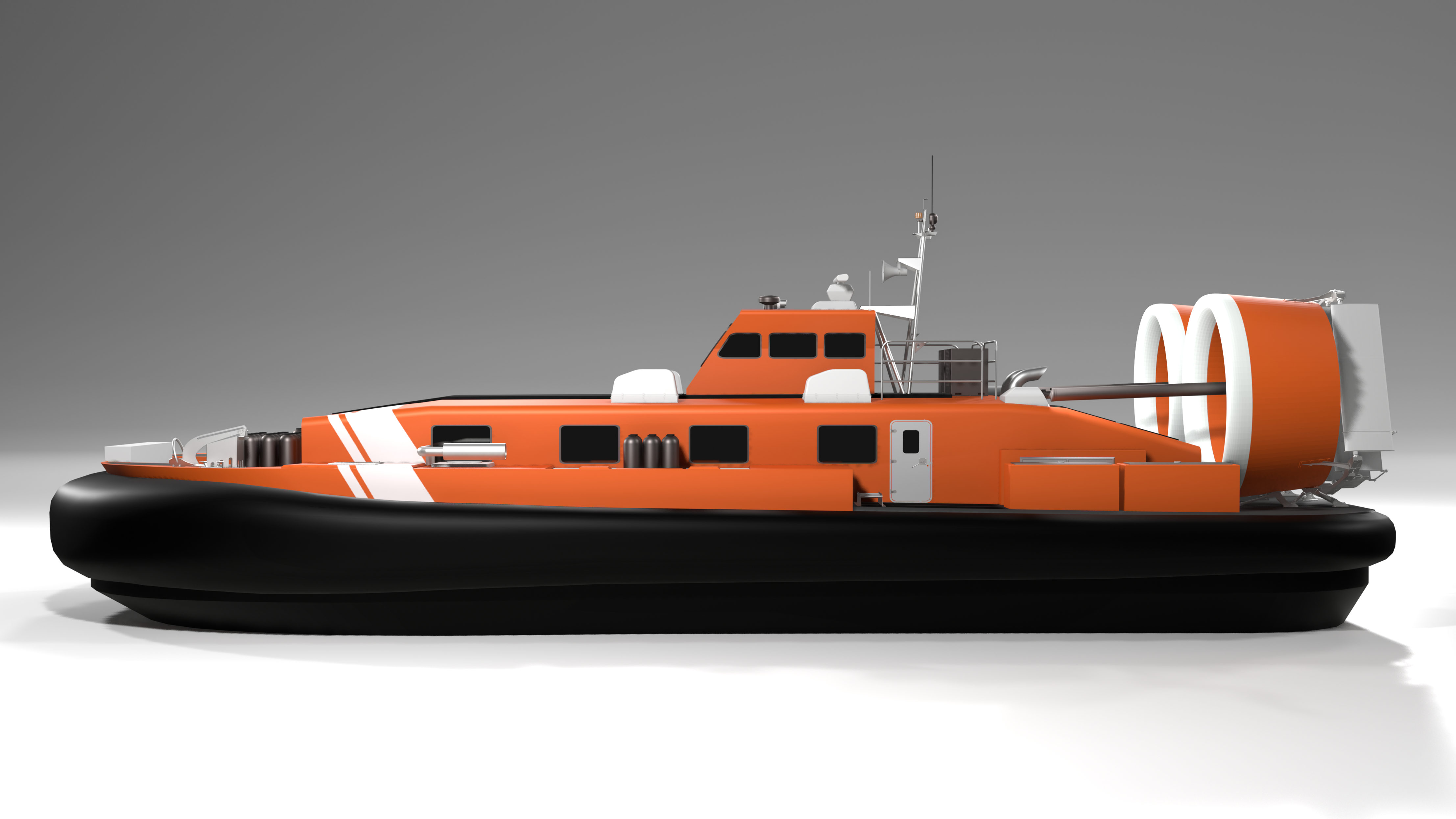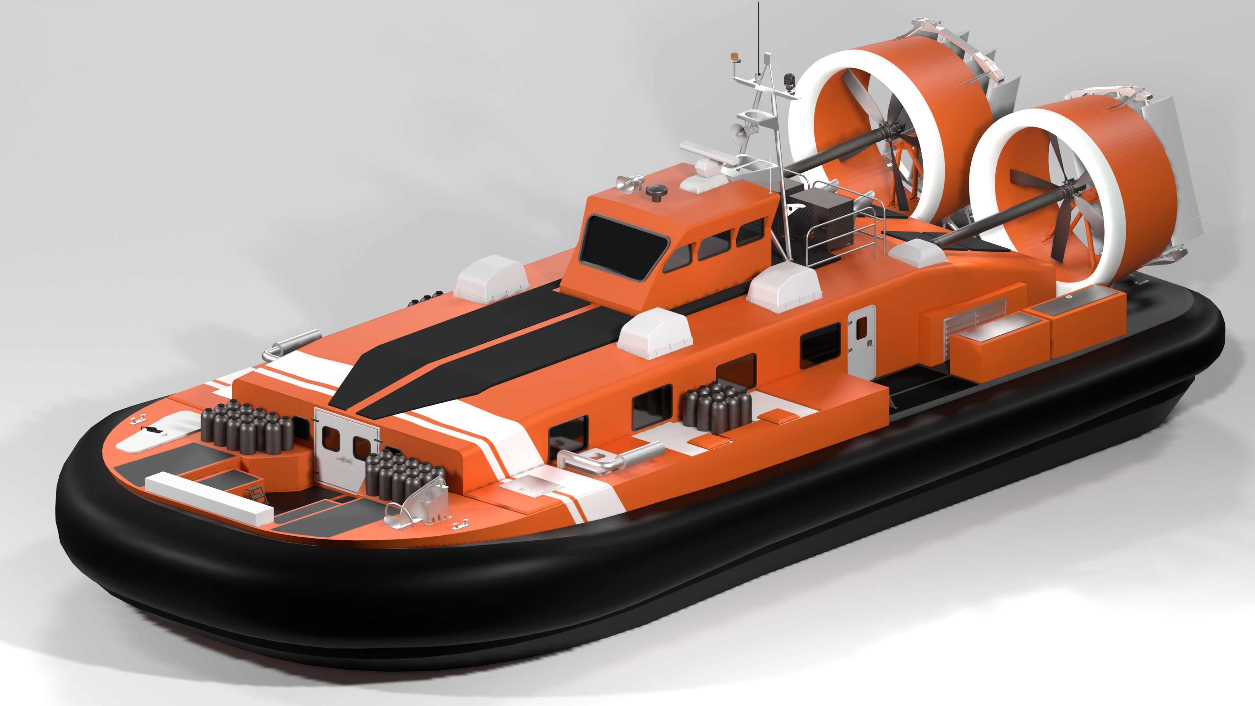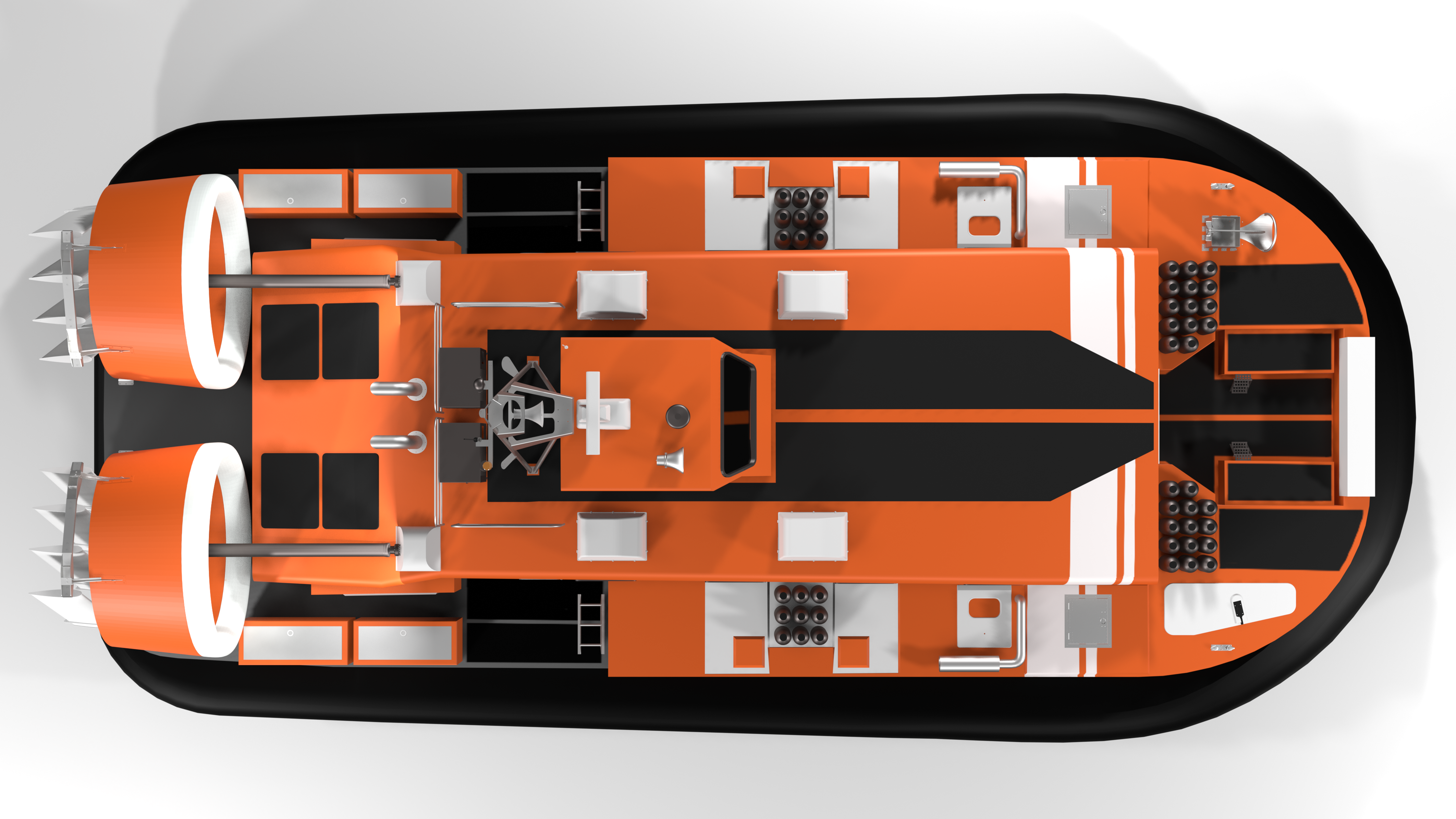 This large-scale hovercraft has been engineered as a critical life-saving platform for offshore oil and gas installations. Built to evacuate up to 142 people in extreme conditions, the design incorporates onboard oxygen tanks and a fully sealed internal air system enabling safe evacuation in environments where fire or toxic fumes make conventional lifeboats unviable. The craft can operate independently of quays, harbours, or calm water, accessing exposed rigs, gas plants, and platforms via beach, mud, or open sea. Its hover-borne profile enables smooth boarding during panic situations, and its internal layout is structured for mass movement, triage, and emergency response.